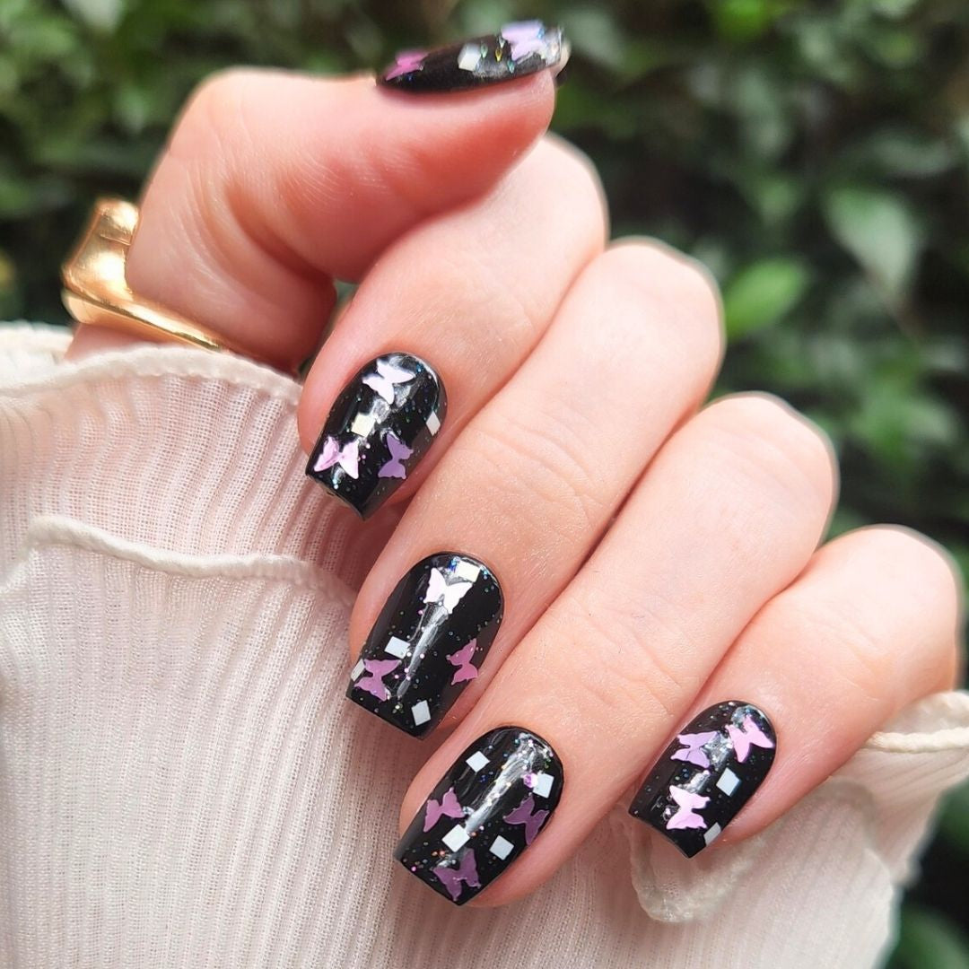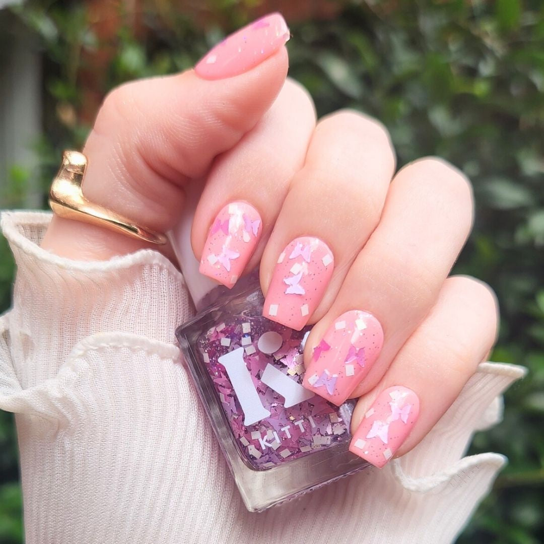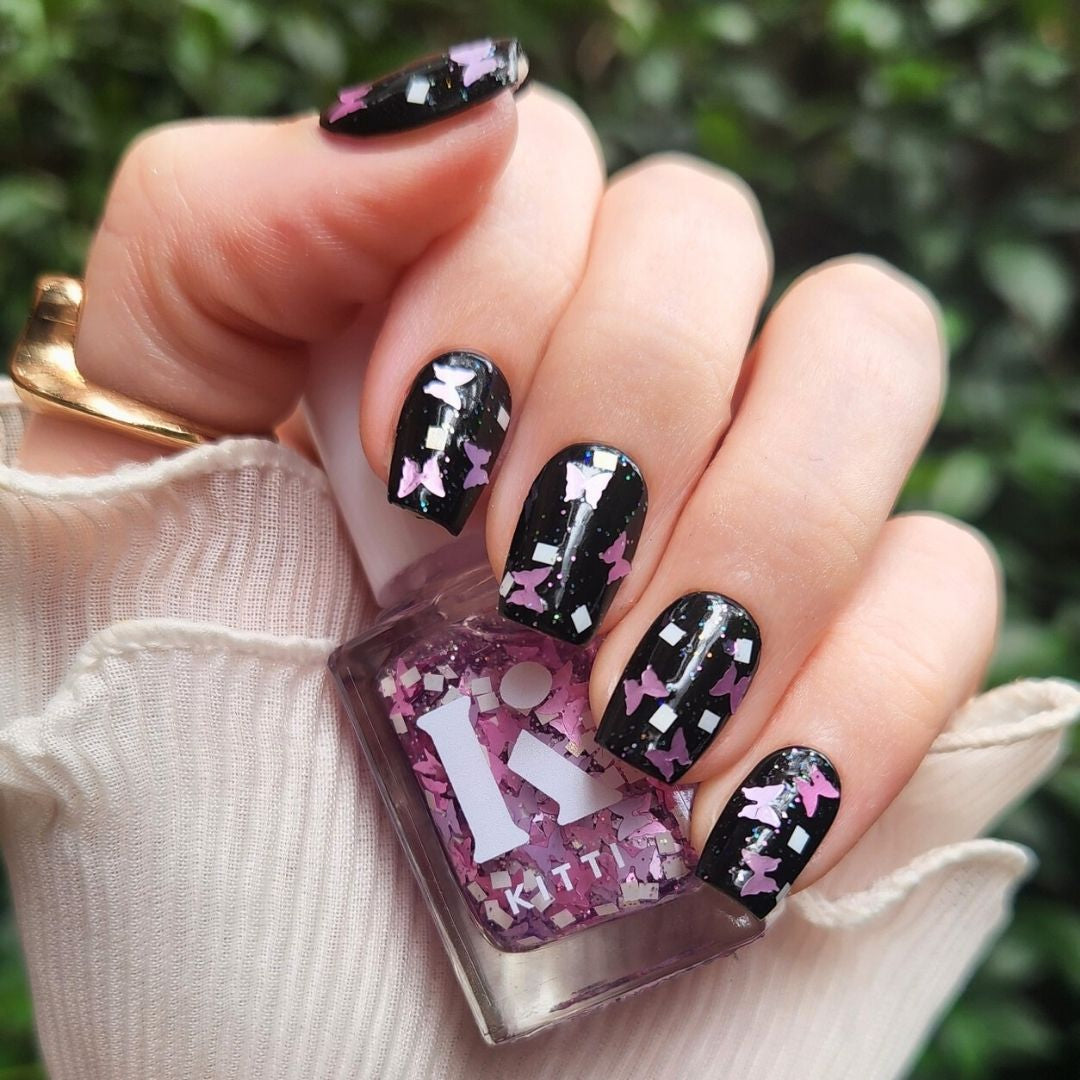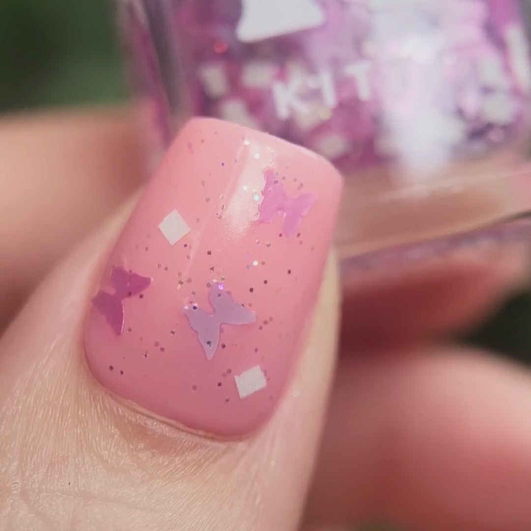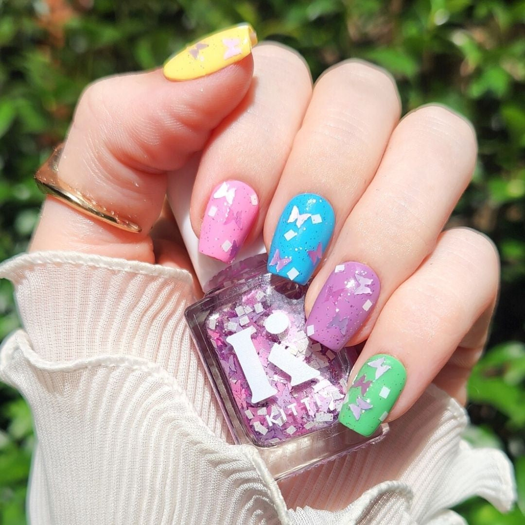 Flutterby is a dreamy glitter topper filled with matte pink and lavender butterfly glitters, paired with a sparkling mix of iridescent glitters for the prettiest playful finish.