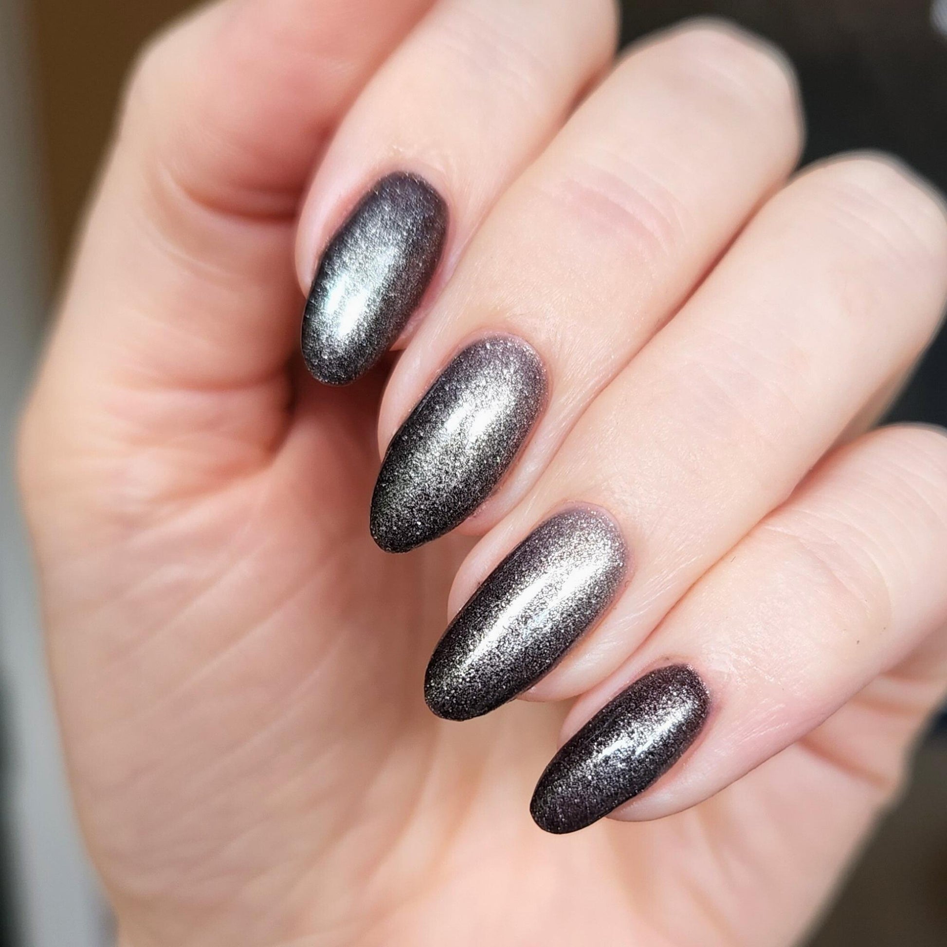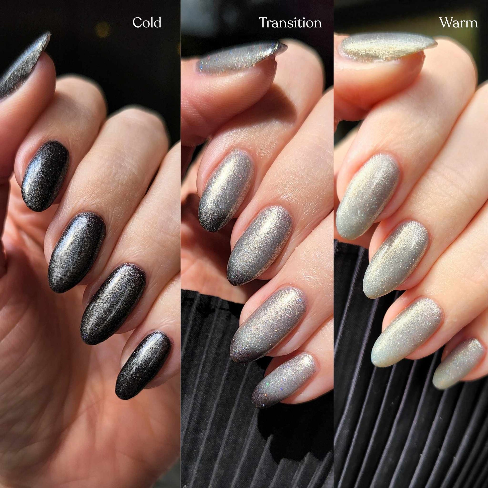 Unleash your inner werewolf with this shape shifting thermal. Black when cold, silver when warm, with a glint of holographic micro glitters that sparkle under the moonlight. A hauntingly magical transformation at your fingertips.