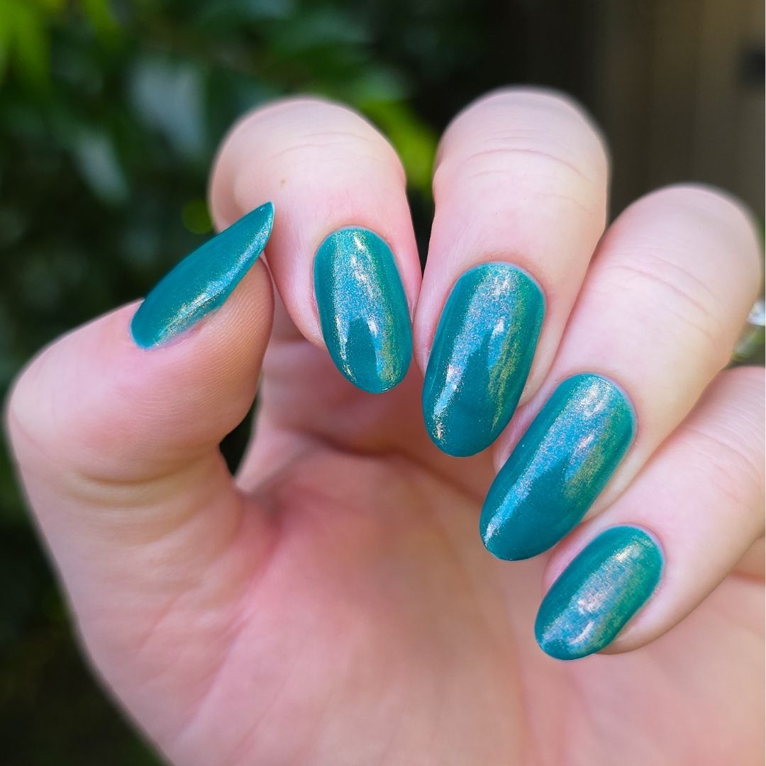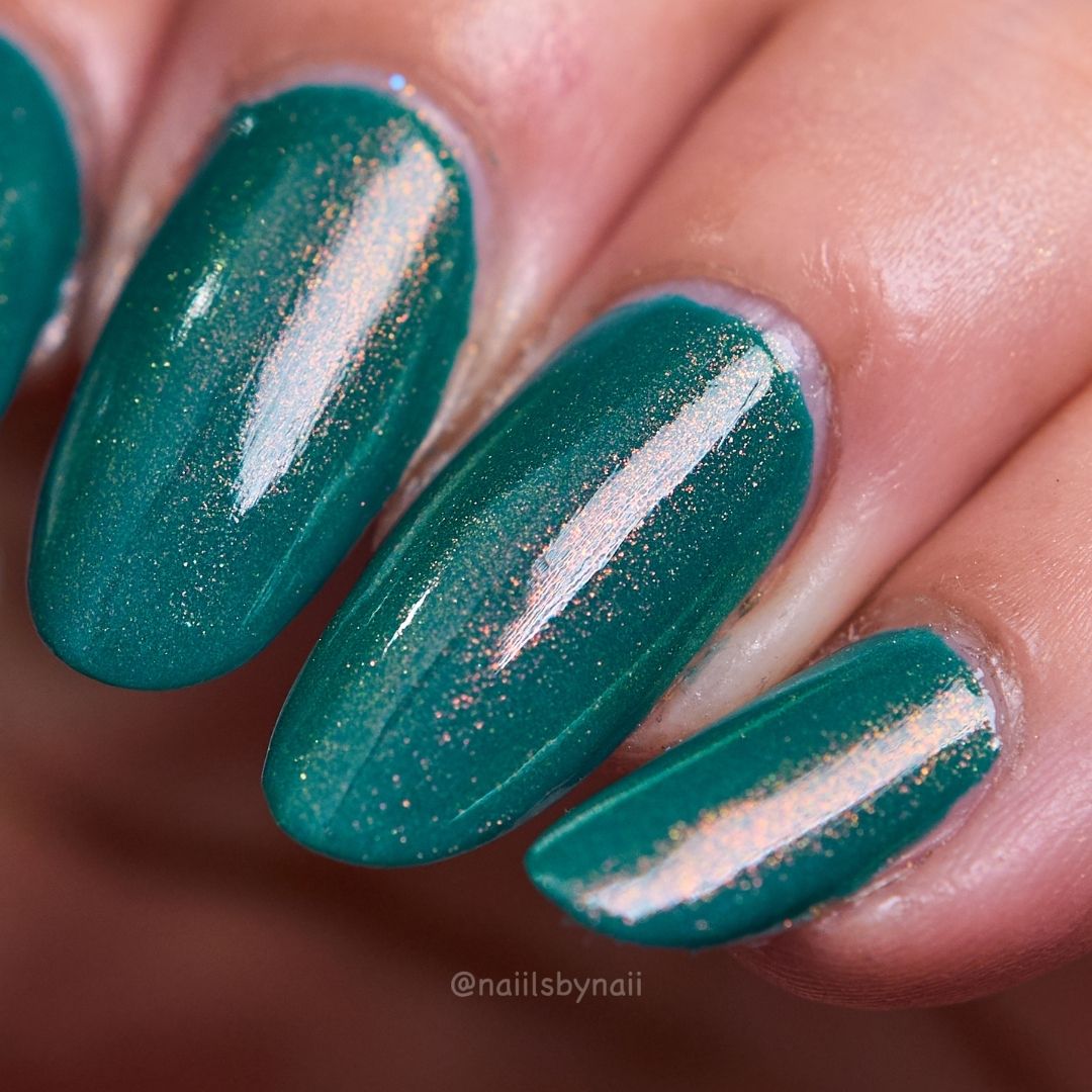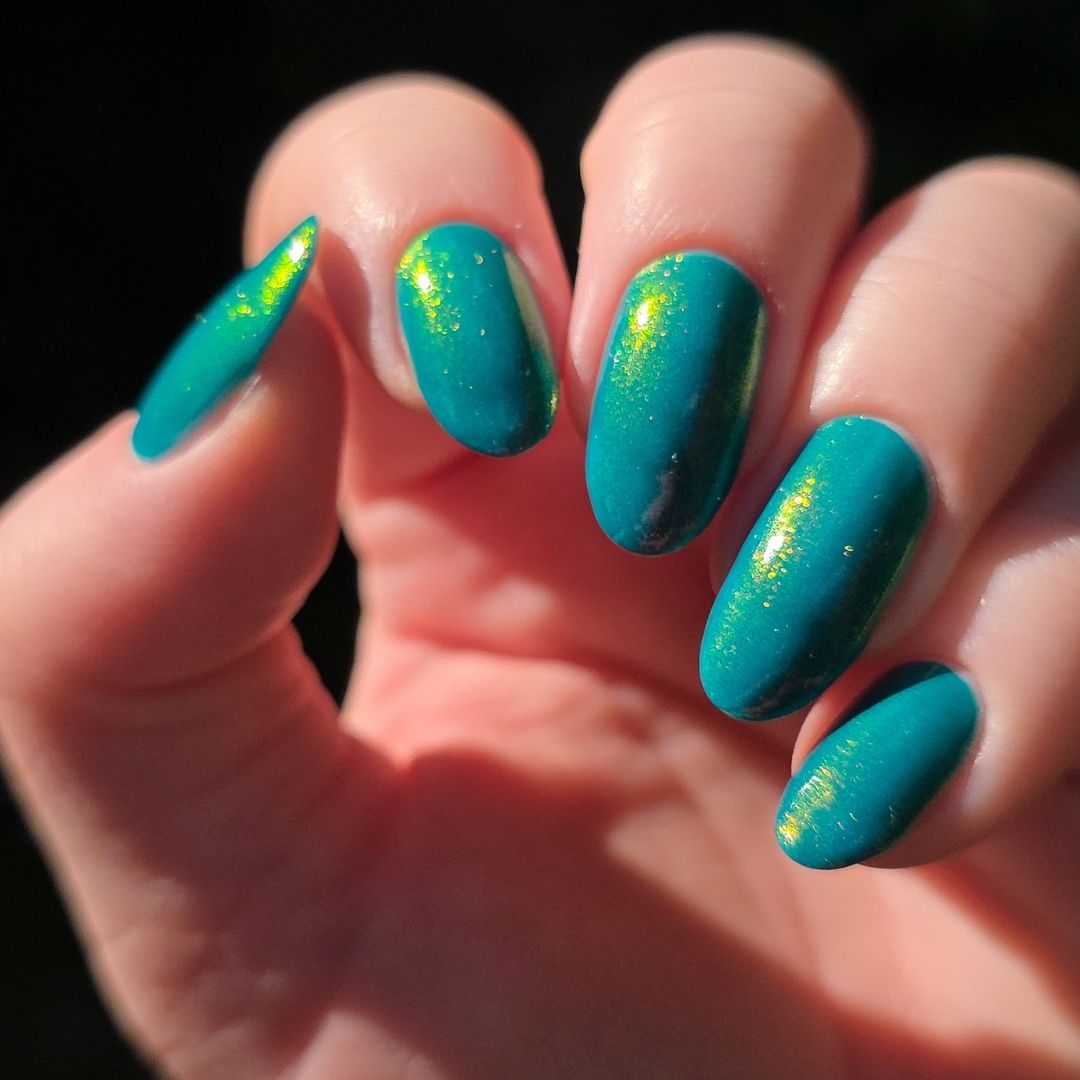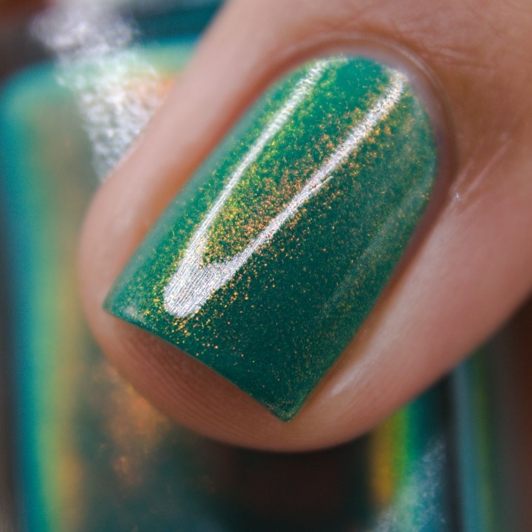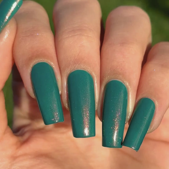Hardware Hero is a deep teal nail polish with a shifting red, orange to green shimmer.