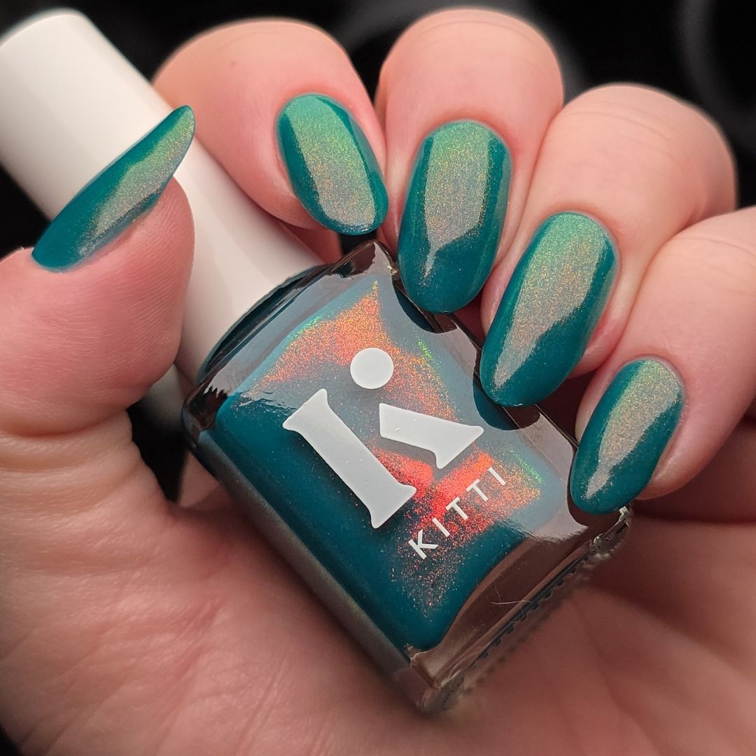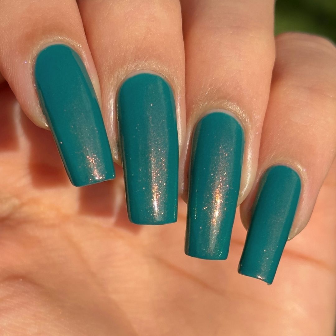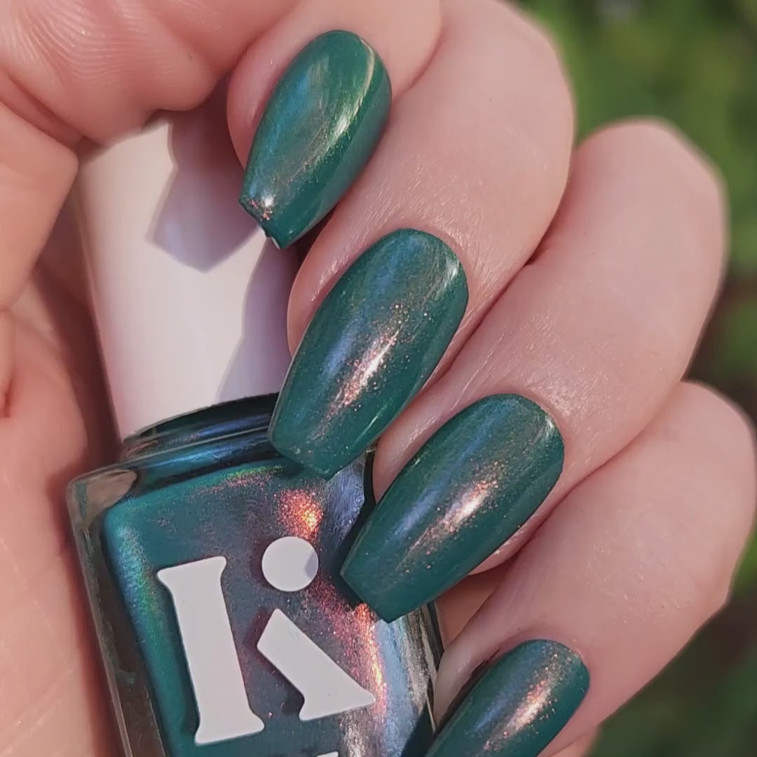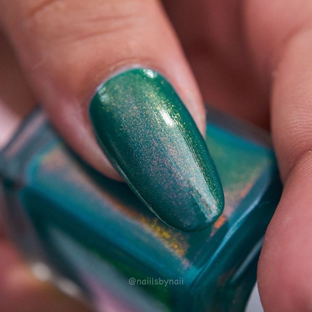 Hardware Hero is a deep teal nail polish with a shifting red, orange to green shimmer.