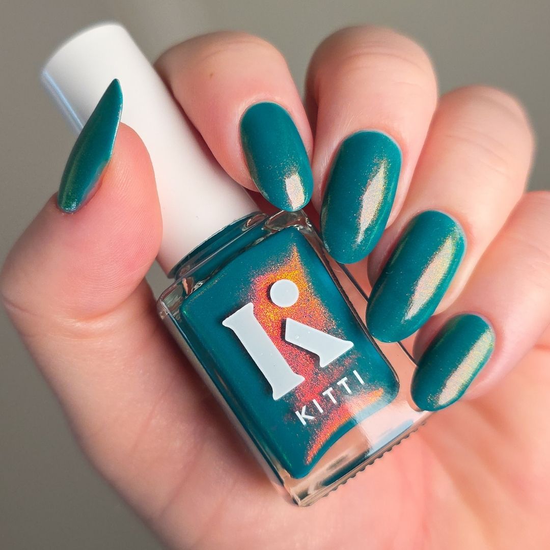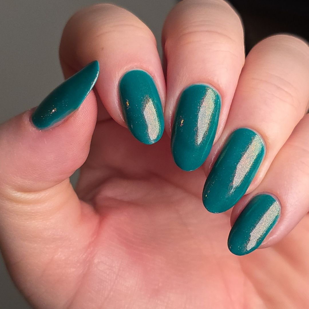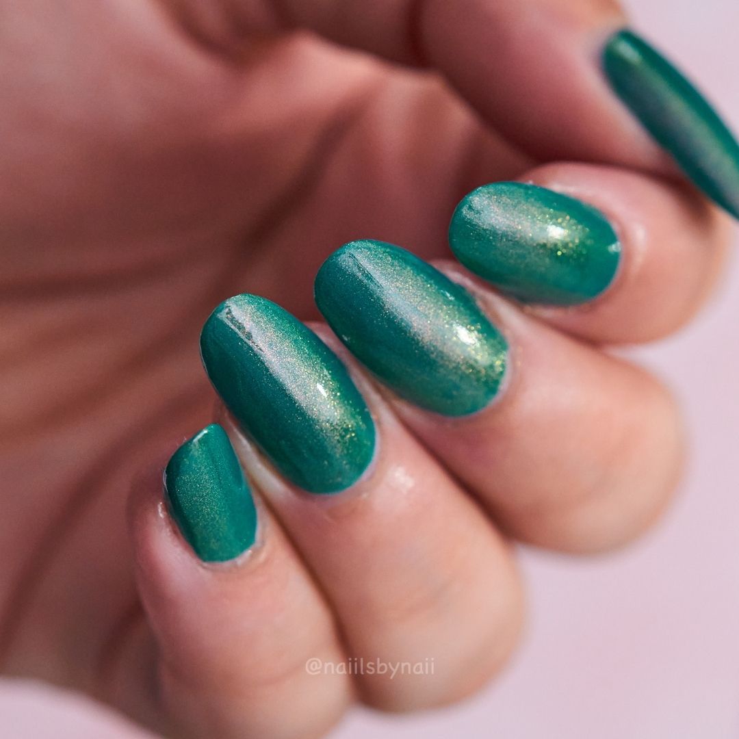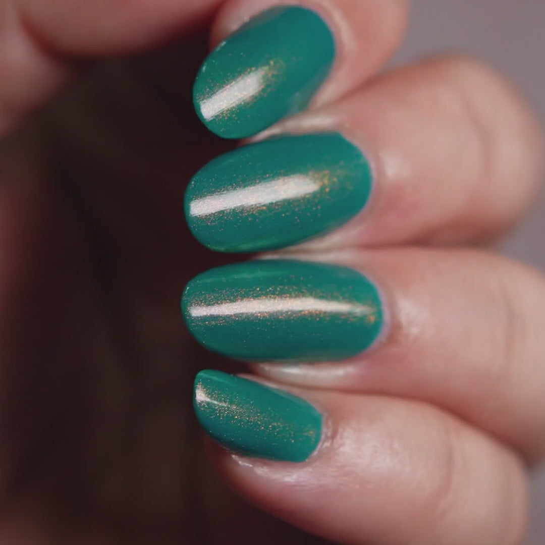 Hardware Hero is a deep teal nail polish with a shifting red, orange to green shimmer.