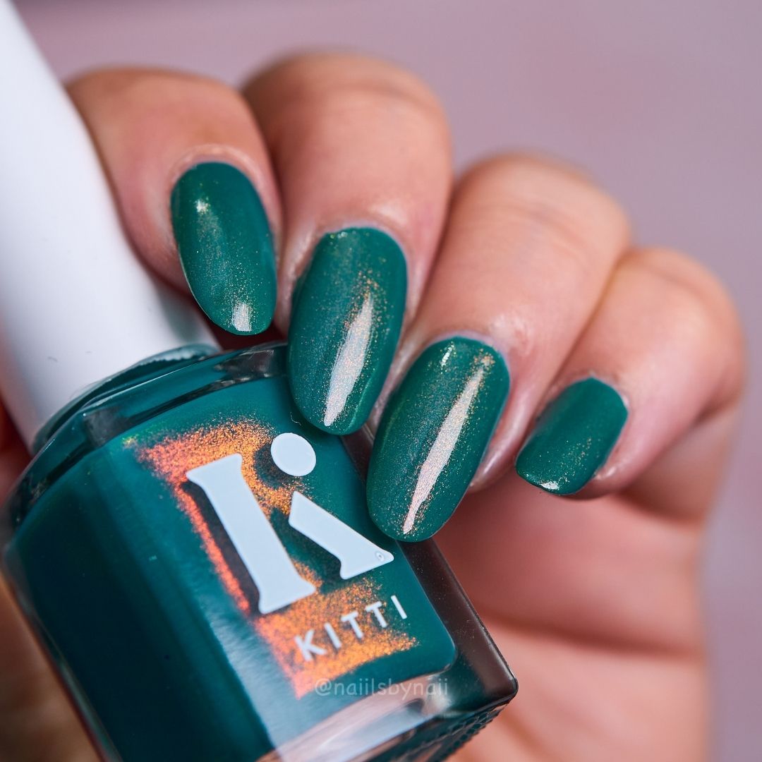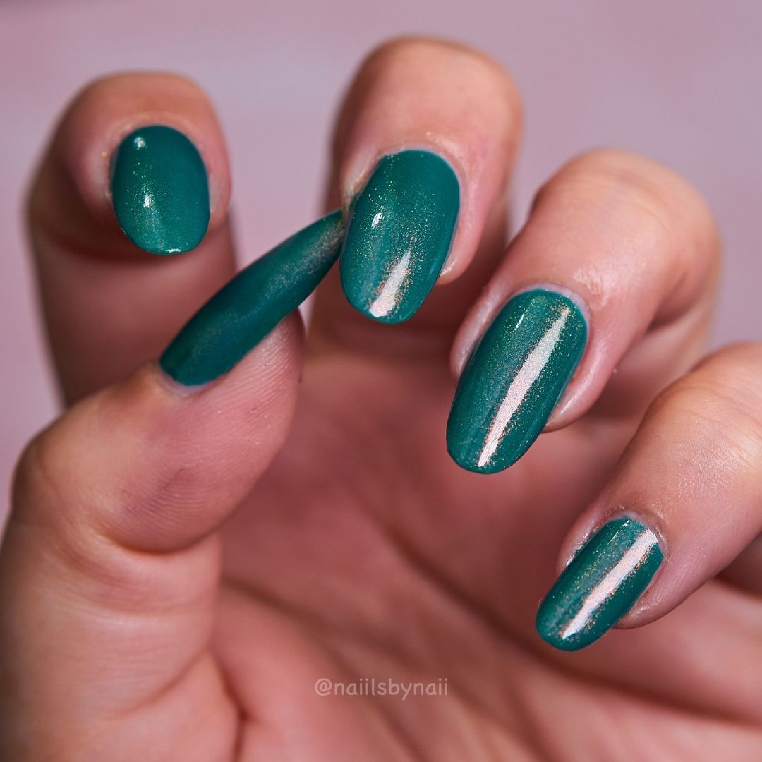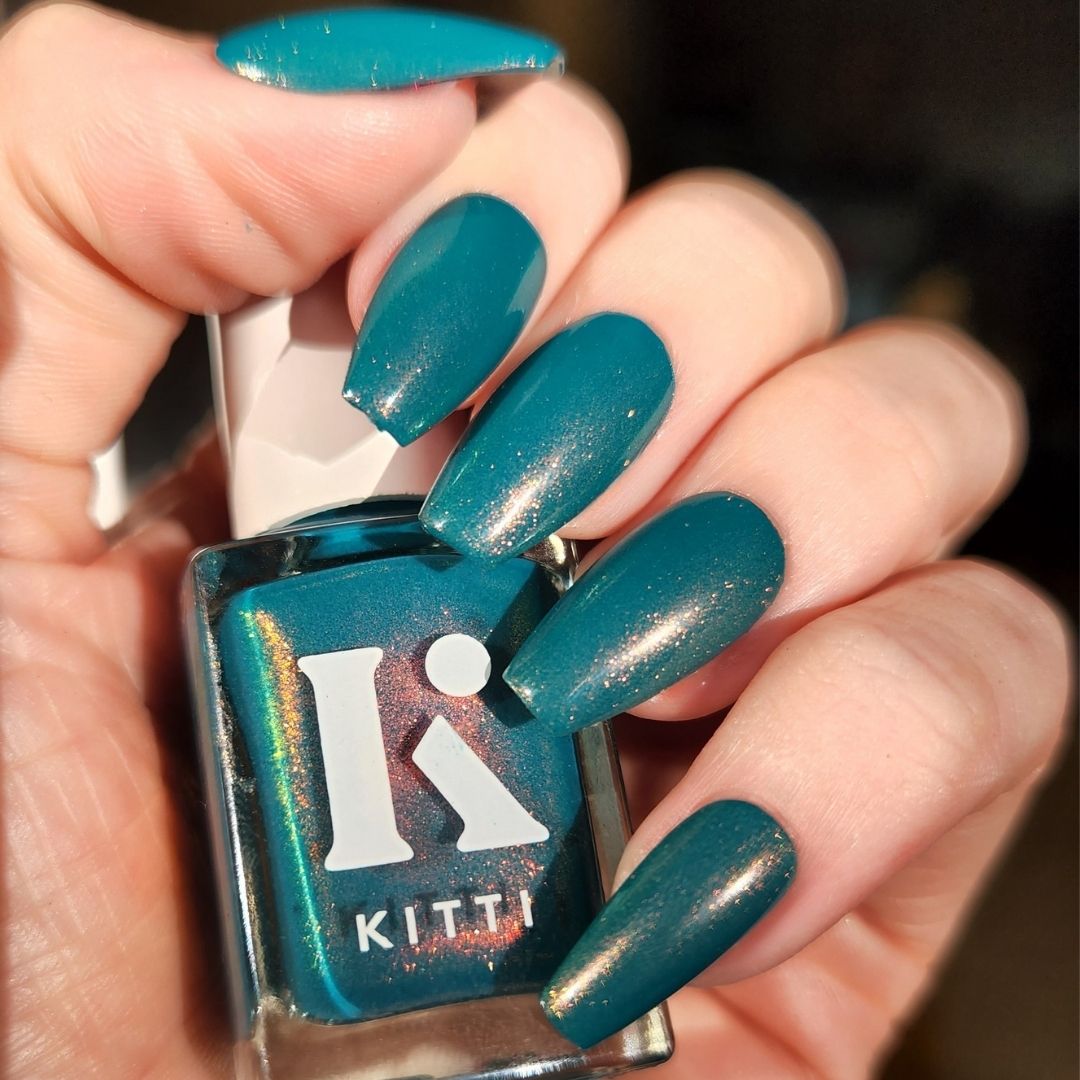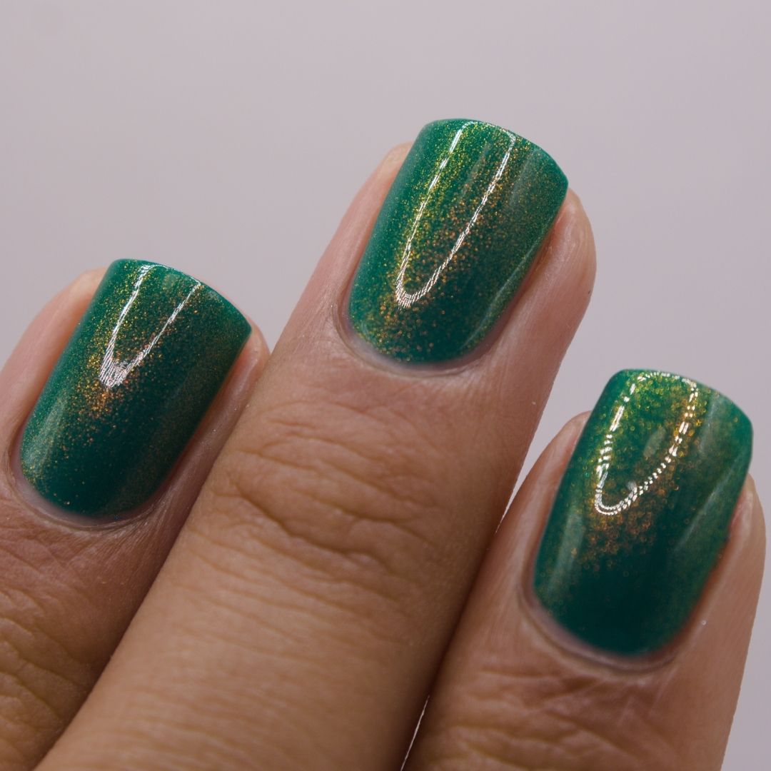 Hardware Hero is a deep teal nail polish with a shifting red, orange to green shimmer.