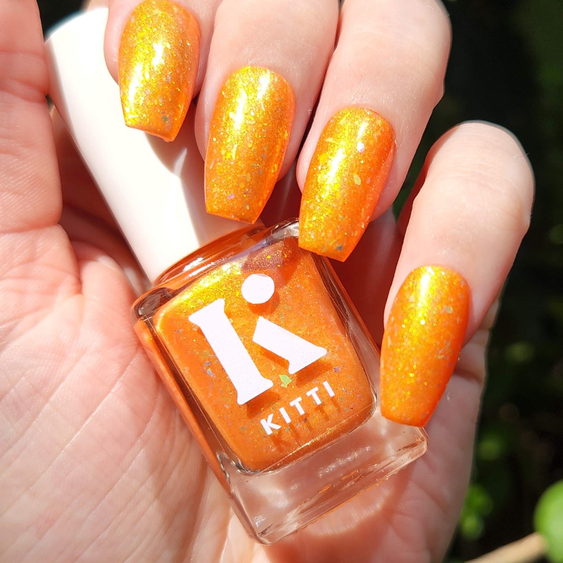 Here Comes the Sun is a vibrant orange jelly polish bursting with golden shimmer and iridescent gold flakes, for a warm, 'lit from within' glow.