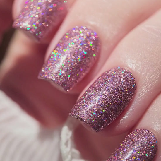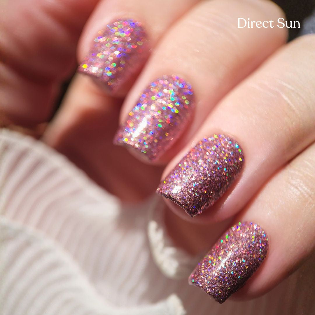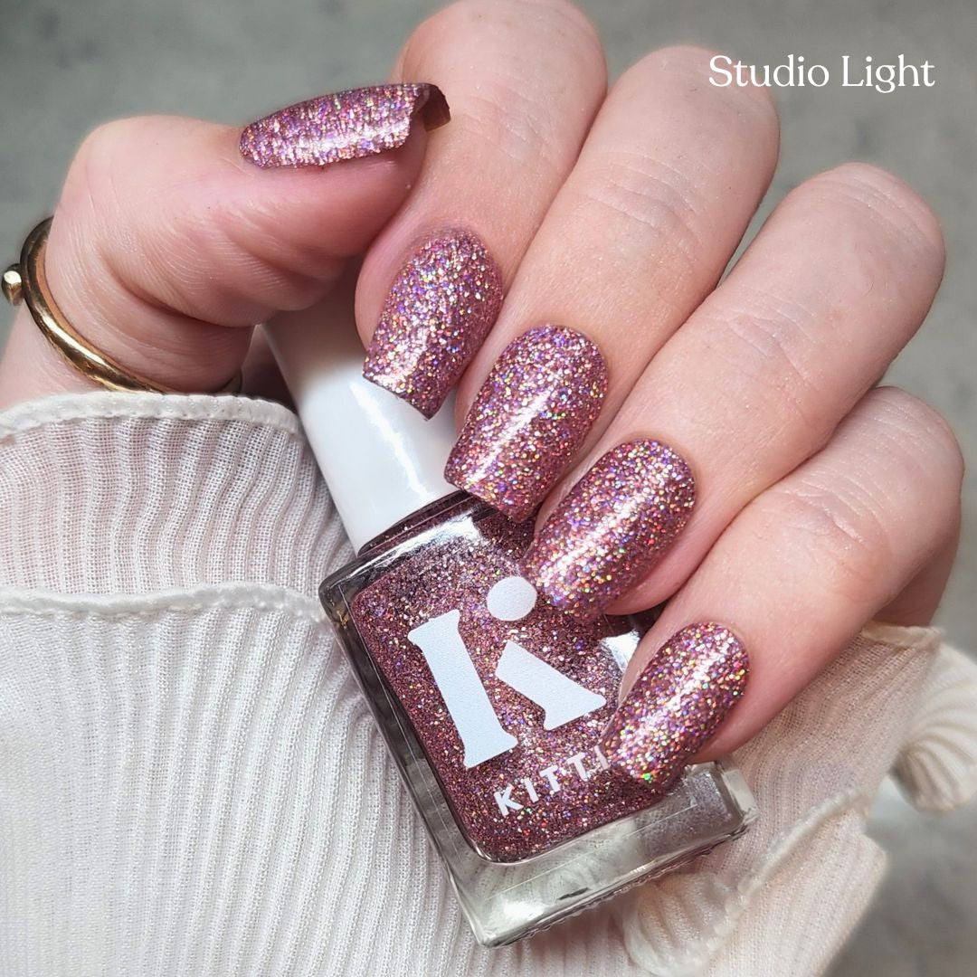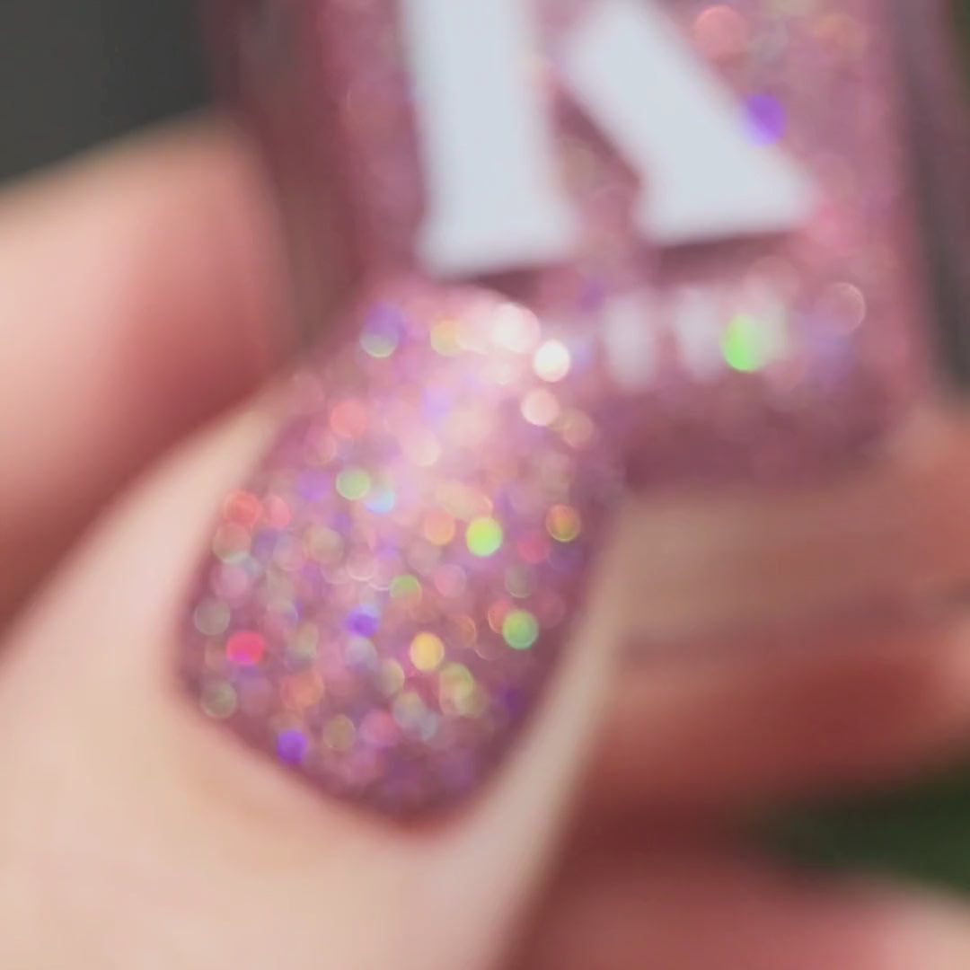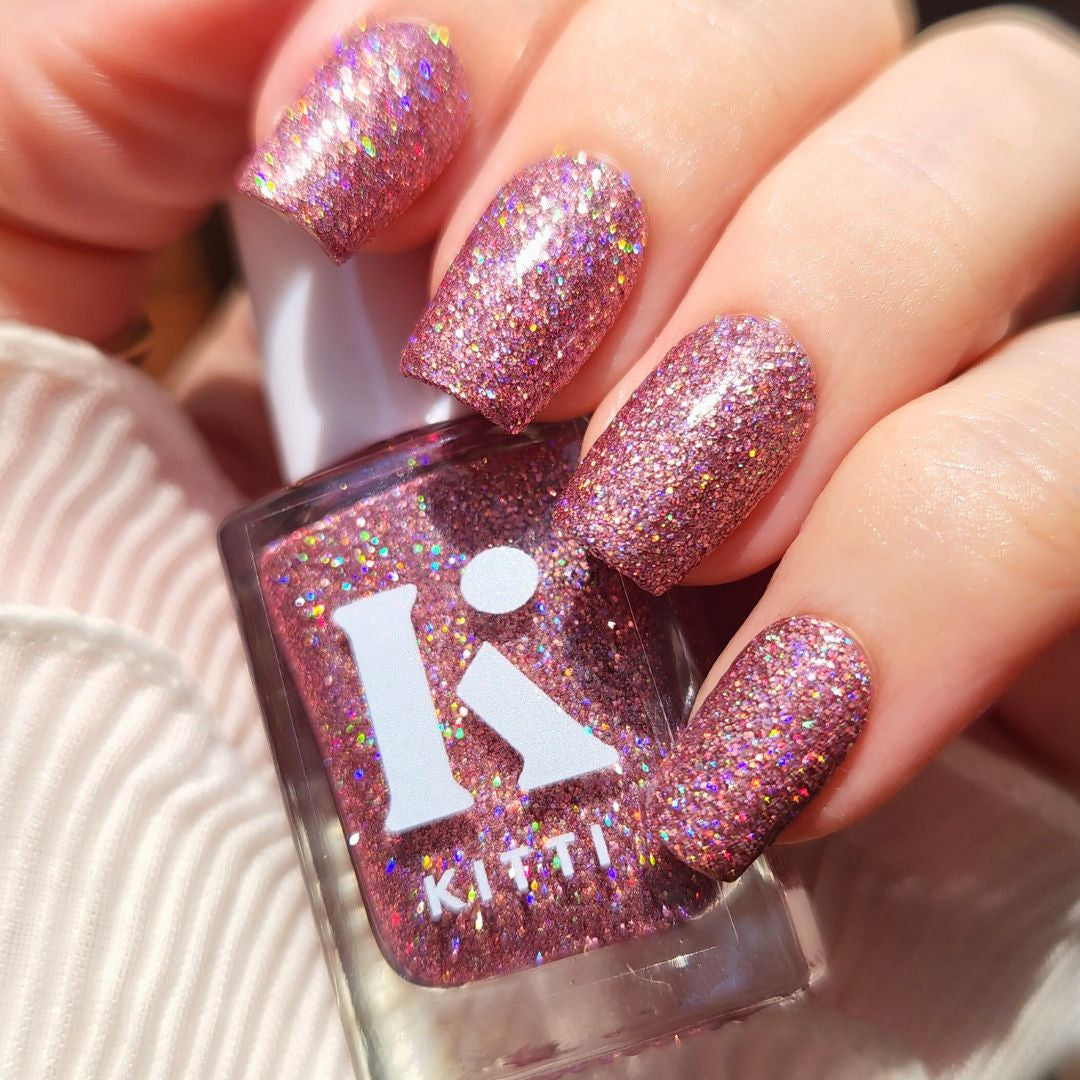 Lover is a dazzling clear-based polish packed with rose-pink holographic glitter that catches every colour in the light. Wear it alone in 2–3 coats for bold sparkle, or layer it as a topper to add extra sparkle over any base colour.