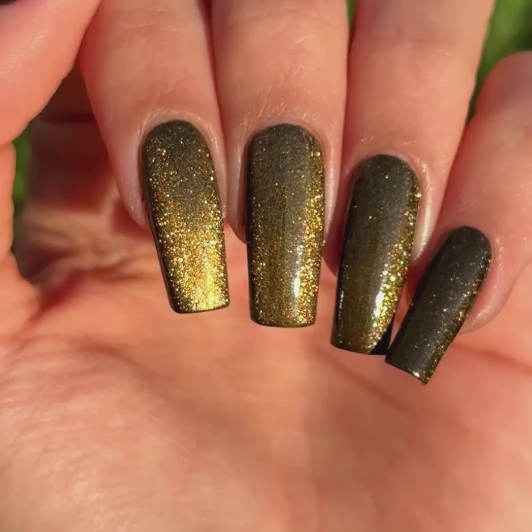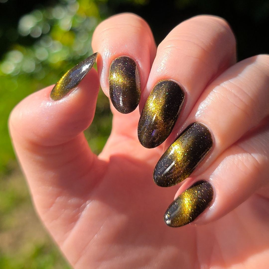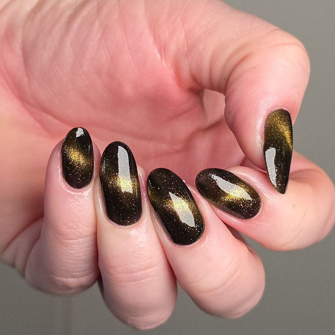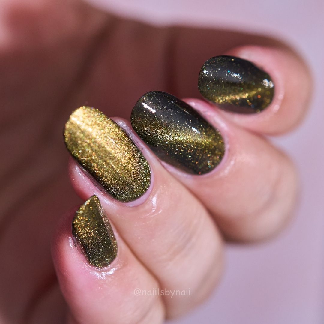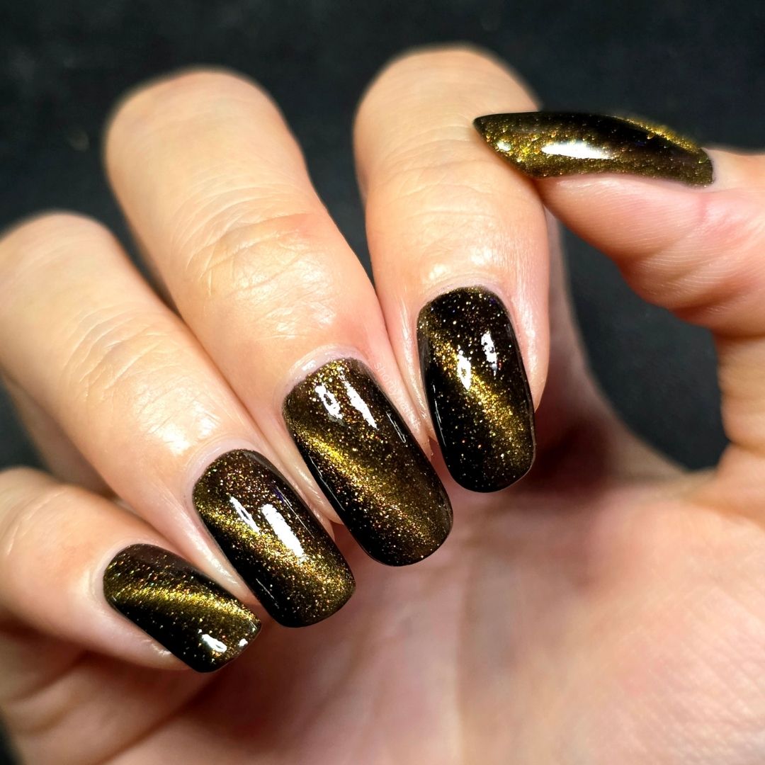Mitey Iconic is a golden magnetic with a blackened base and subtle gold holo glitters.