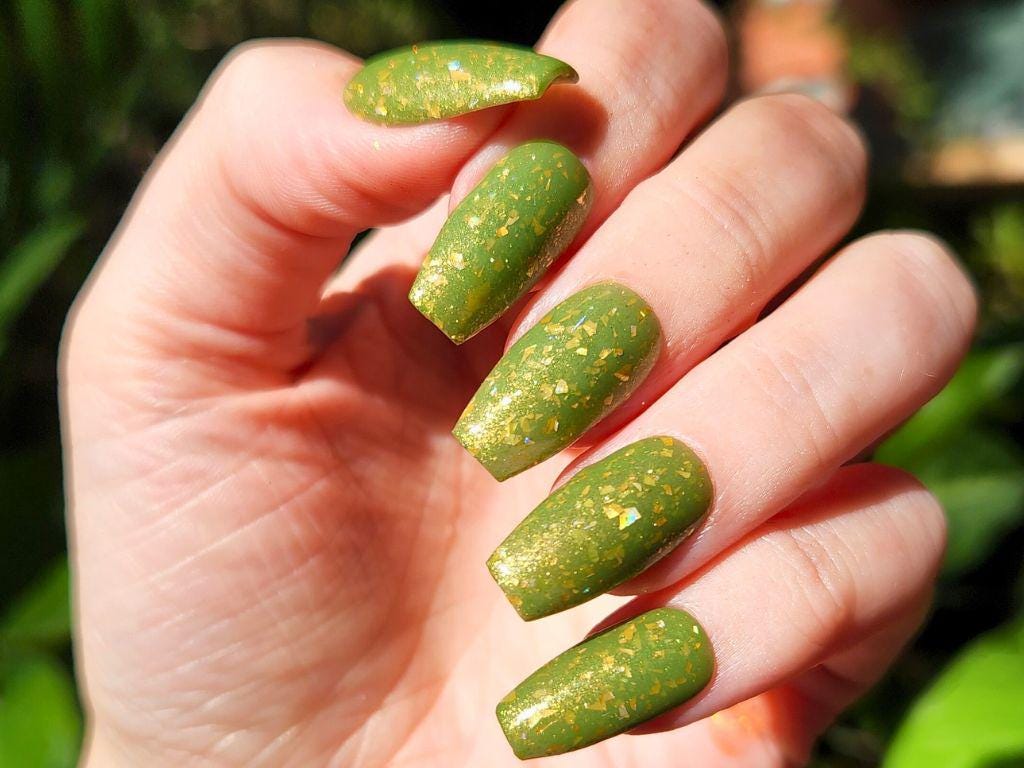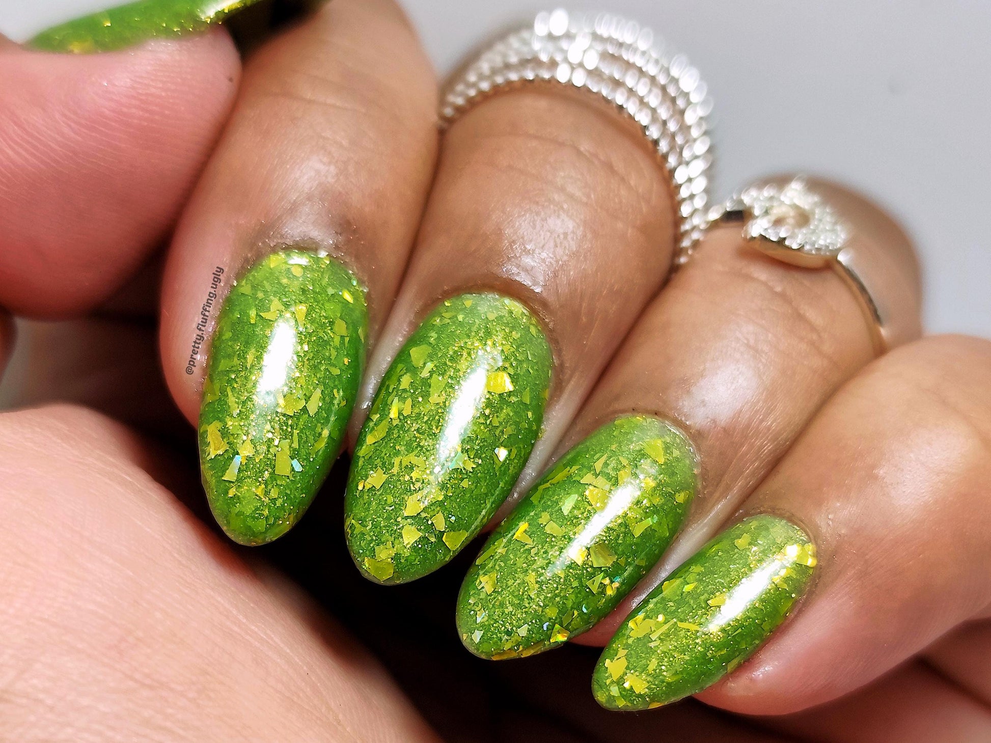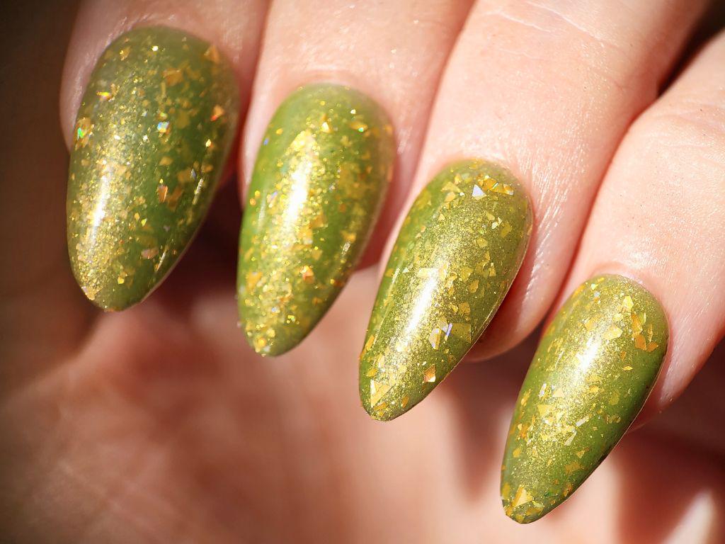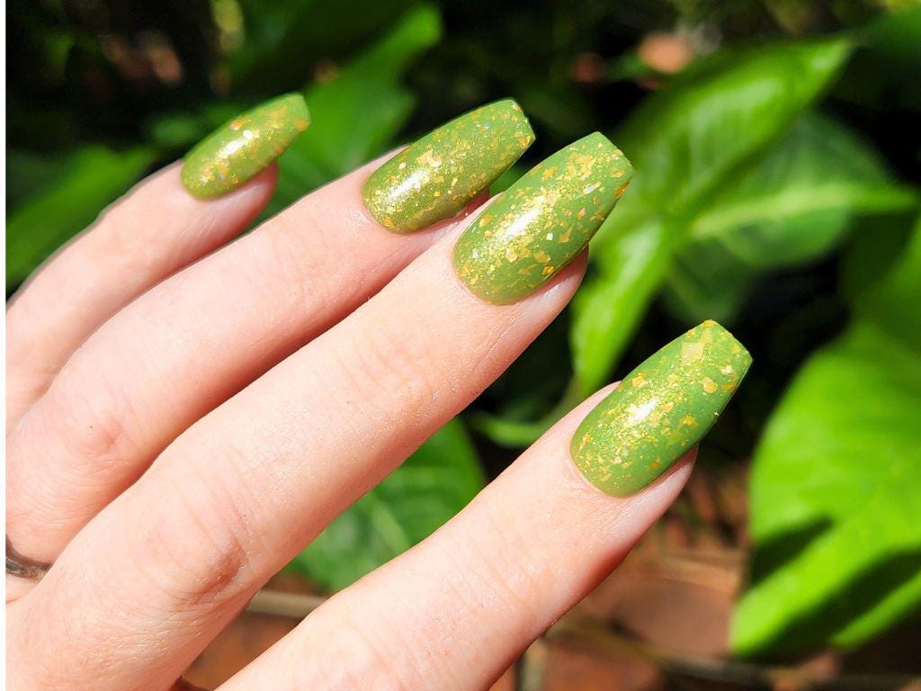 Money Grows on Trees is a lush green jelly nail polish infused with striking gold shimmer and holographic gold flakes, creating a radiant, sparkling glow.