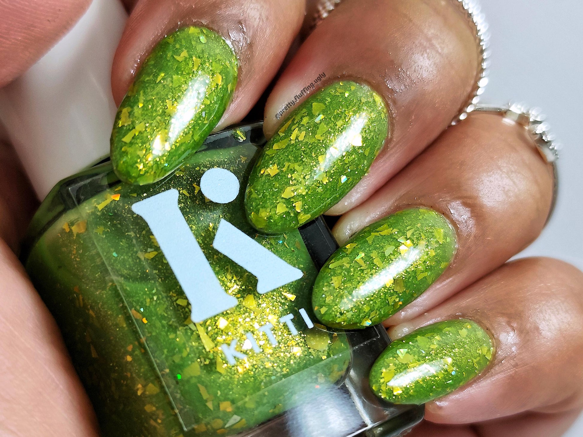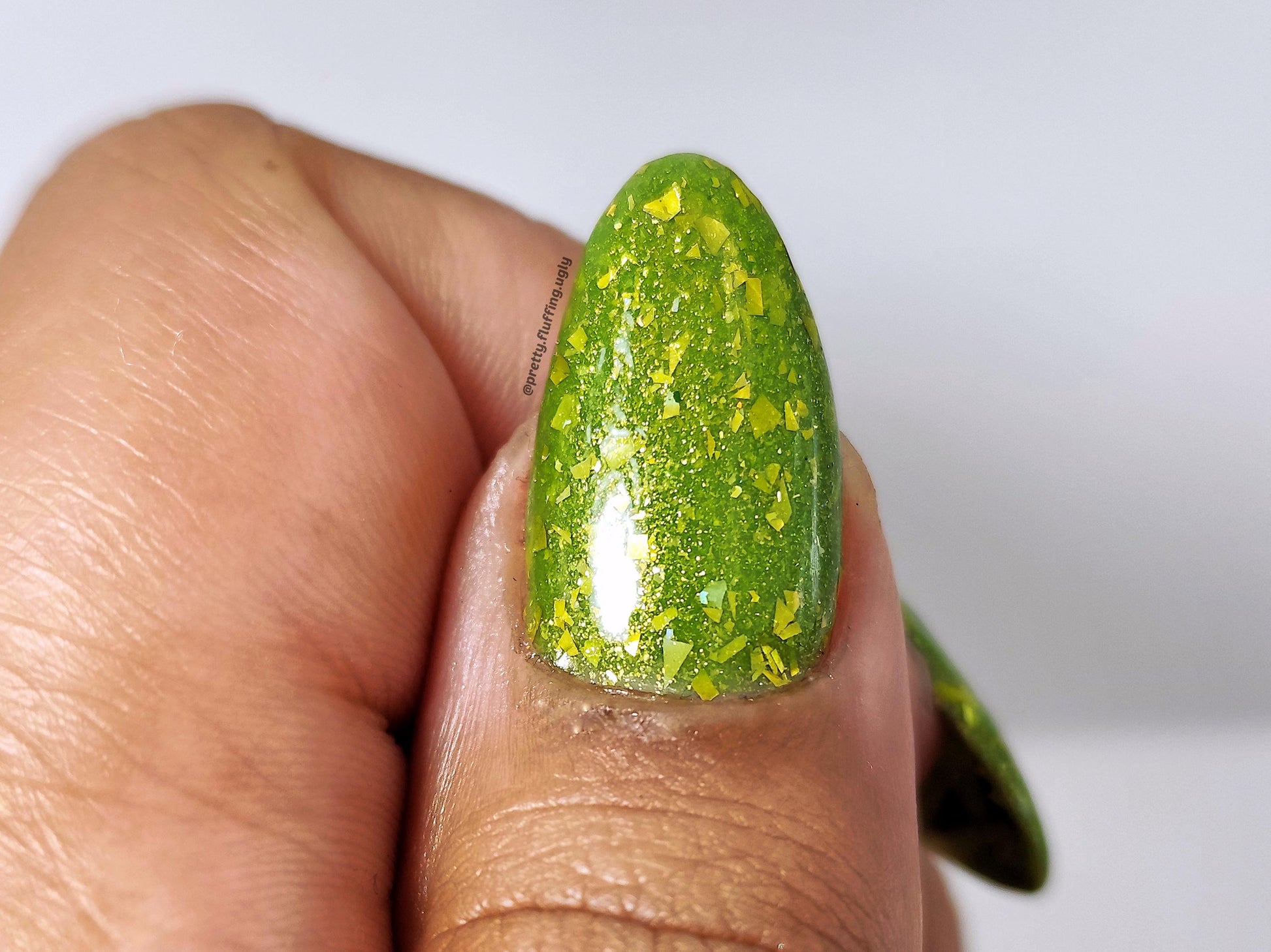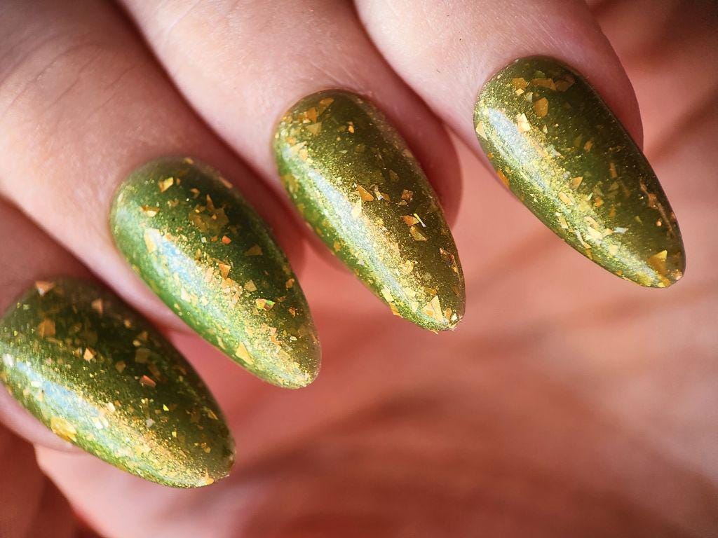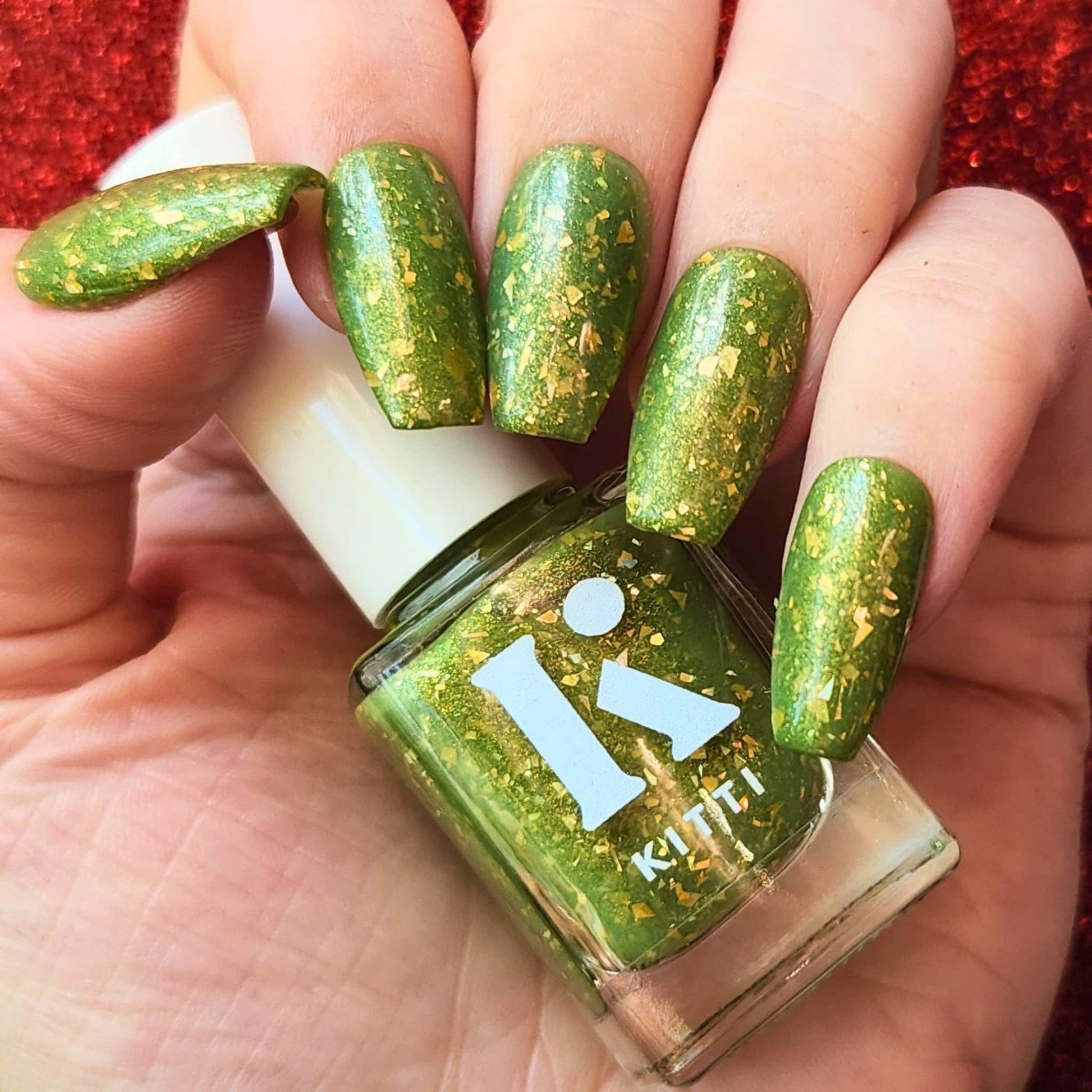 Money Grows on Trees is a lush green jelly nail polish infused with striking gold shimmer and holographic gold flakes, creating a radiant, sparkling glow.