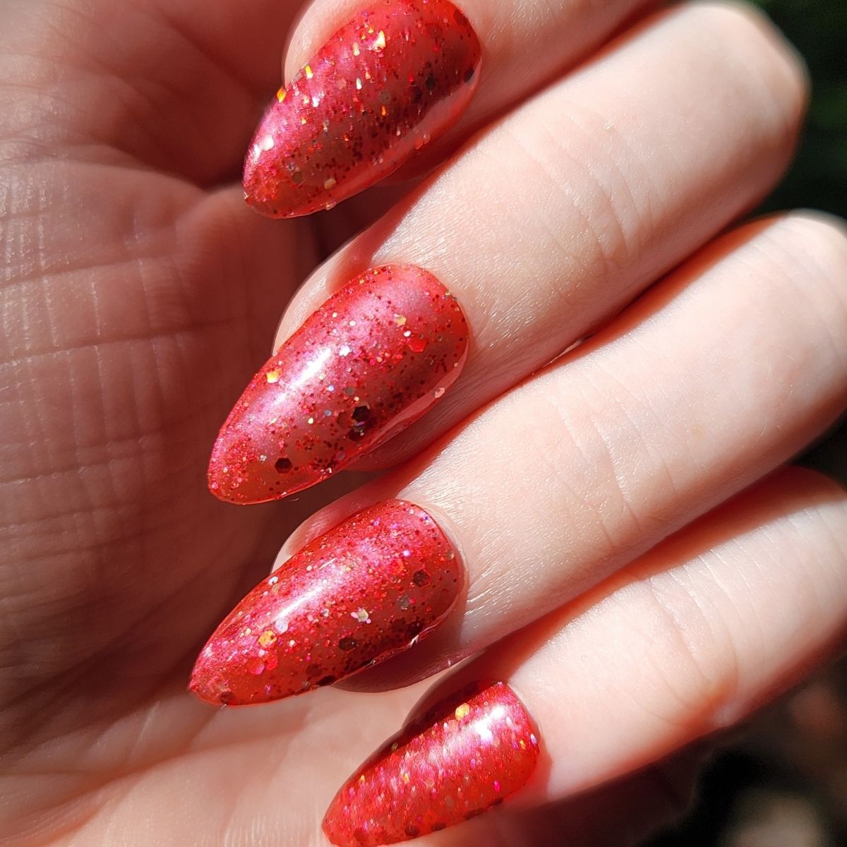 Such a pretty colour! I love the way it catches the light and shimmers from a terracotta-pink to a sunset-orange. Did 3 layers with a base coat and a top coat. Couldn't recommend enough!